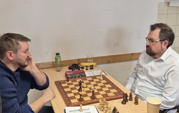 Klaus spielte mit Schwarz eine verrückte Partie. Nach einem fehlerhaften Bauernzug stand er früh auf Verlust, doch die Stellung blieb taktisch, so dass alles möglich war. In einer Phase verpasste Klaus ein Matt, bevor sein Gegner wieder die Oberhand gewann. Klaus landete im Endspiel mit Minusqualität, stellte jedoch eine stabile Festung auf, durch die Weiß nicht mehr durchkam. Ein hart erkämpftes Remis aus einer Partie, die in jede Richtung hätte kippen können.